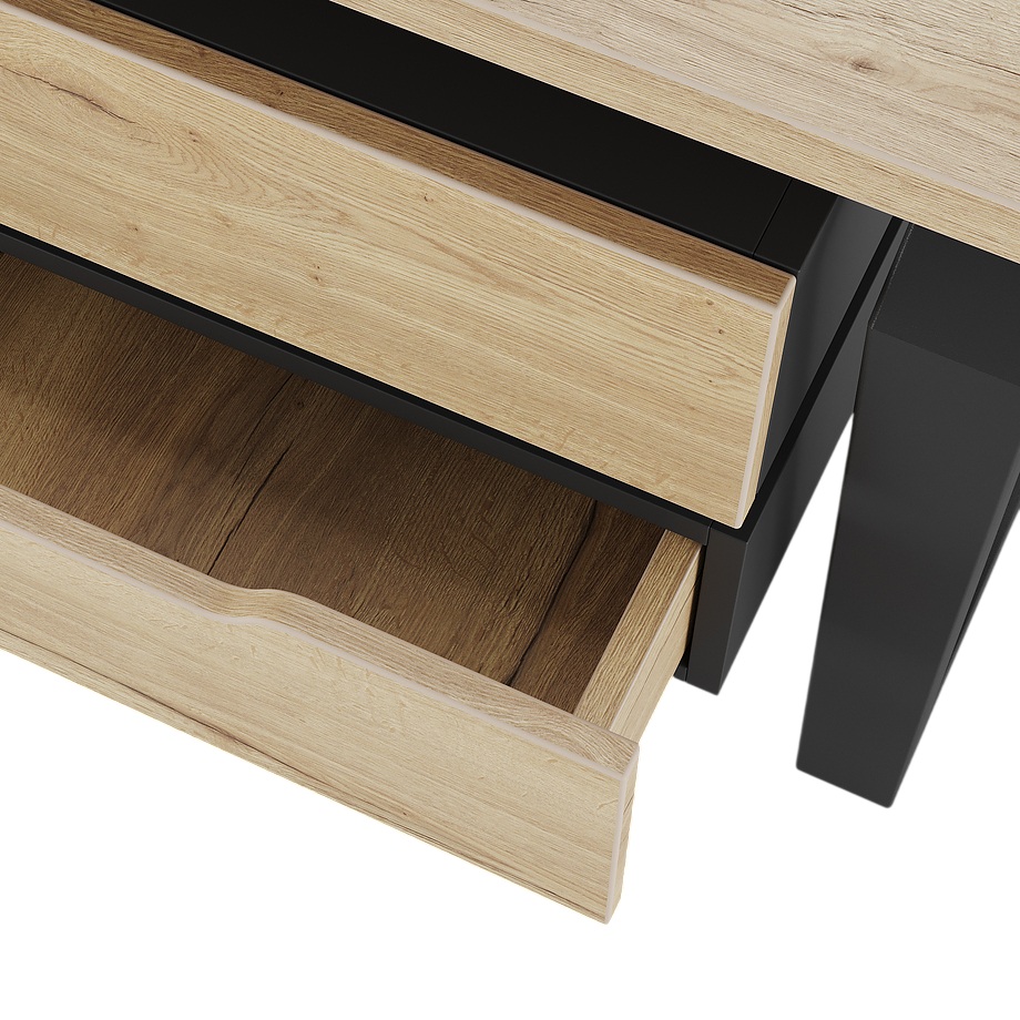 Офисный стол КОБОР TB-140/70 black/natural используется в офисных помещениях и кабинетах руководителей. Конструкция модели включает опоры, выполненные в виде перевернутой трапеции со скошенными верхними углами. Материал столешницы - прочный ЛДСП толщиной 25 мм, усиленная снизу металлическим каркасом, материал опор - окрашенный металл.