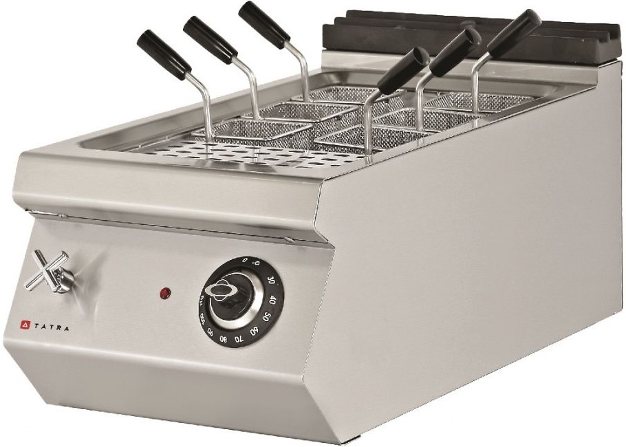 Электрическая макароноварка Tatra TEP.47 используется на предприятиях общественного питания и торговли для варки пельменей, вареников, макаронных изделий, кукурузы, фрикаделек и овощей. Модель оснащена регулировкой температуры, кранами для залива и слива воды и регулируемыми ножками. Материал корпуса - высококачественная нержавеющая сталь.