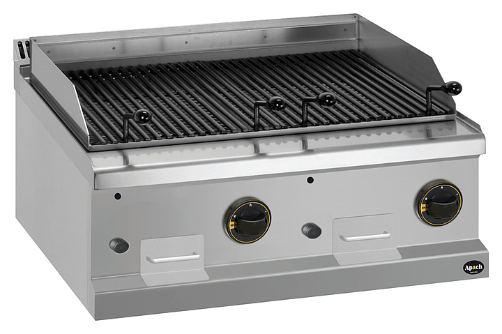 Лавовый гриль Apach APGG-77T/PL серии 700-й используется на предприятиях общественного питания, торговли и пищевых производствах для жарки мяса, рыбы и овощей. Модель оснащена механическим управлением, горелкой, пьезоэлектрическим поджигом, системой стабилизации пламени, съемным лотком для сбора остатков пищи, масло или жира и бортиками. Материал корпуса и панели управления - высококачественная нержавеющая сталь AISI 304, материал боковых и задней панели - высококачественная нержавеющая сталь AISI 430, материал горелки и лотка - нержавеющая сталь.
