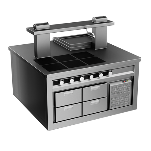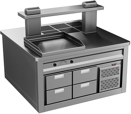 Кухонный остров Astropit АКМБ05-320.180.10МТ имеет 10 мест под встраиваемые технологические модули, основу на 5 отсеков и 3 секции под холодильные столы. Размеры острова 3200х1800х900 мм.