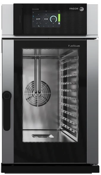 Пароконвектомат Fagor K-APW-101-E LW R K предназначен для приготовления широкого спектра блюд, а также для выпечки хлебобулочных и кондитерских изделий на предприятиях общественного питания, торговли и пищевых производствах. Модель оснащена электронной панелью управления, сенсорным экраном Touch Screen с диагональю 10,1" подсветкой камеры и термощупом. Корпус выполнен из нержавеющей стали.