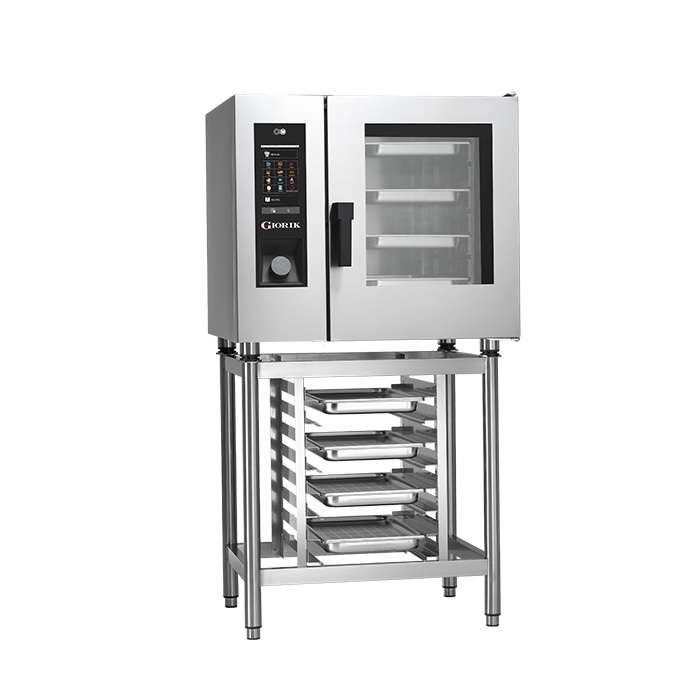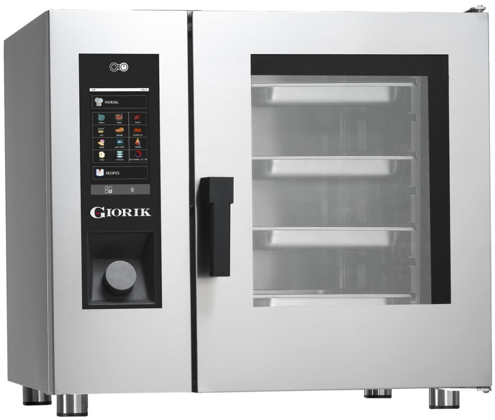 Пароконвектомат Giorik Steambox Evolution R SERE061W используется для приготовления различных блюд и выпечки хлебобулочных и кондитерских изделий на предприятиях общественного питания, торговли и пищевых производствах. Модель оснащена электромеханическим управлением, дисплеем 7", предохранительным термостатом для защиты от перегрева, ручным душем, 1-точечным термощупом, вентилятором в задней стенке, термоизоляционной ручкой, каплесборником и устойчивыми нескользящими опорами. Материал корпуса и внутренней облицовки - высококачественная нержавеющая сталь, материал двери - двойное стекло.