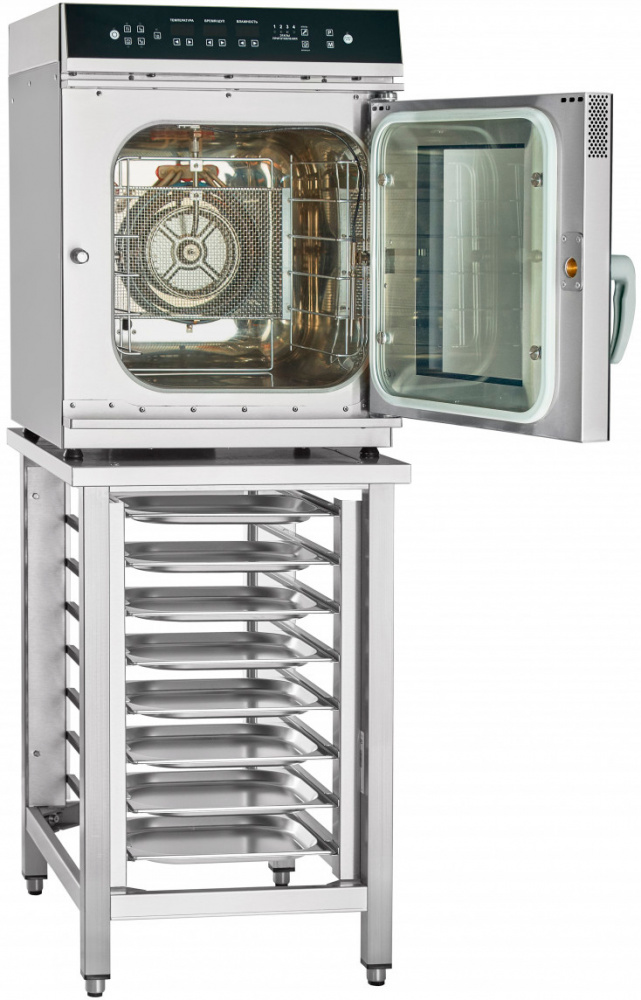 Благодаря небольшим габаритным размерам пароконвектомат подходит для помещений с ограниченным пространством и размещается на столе или подставке.