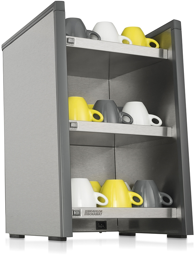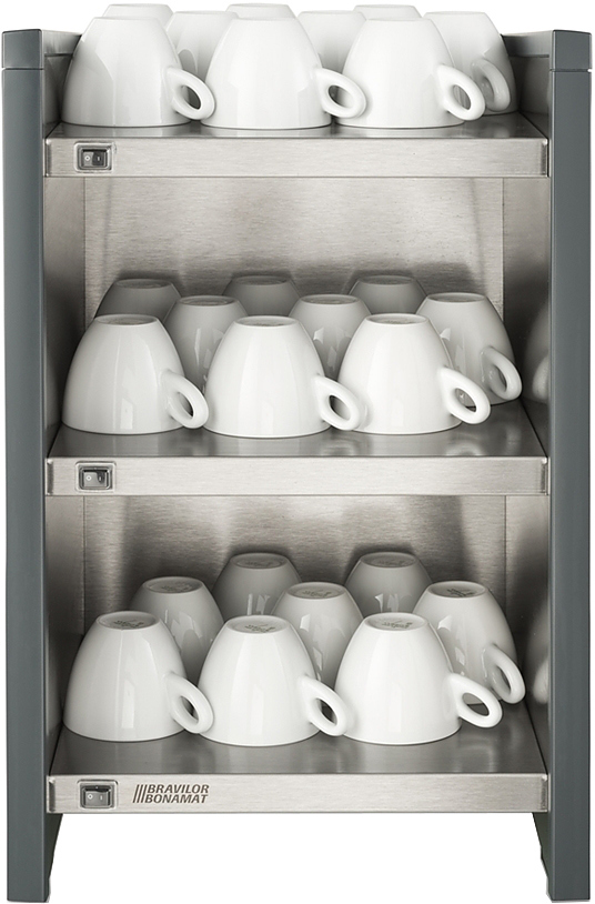 Подогреватель чашек Bravilor Bonamat WHK используется на предприятиях общественного питания, торговли, пищевых производствах и в офисах совместно с кофемашинами и кофеварками. Модель оборудована 3 полками с раздельным подогревом. Материал корпуса - нержавеющая сталь.
