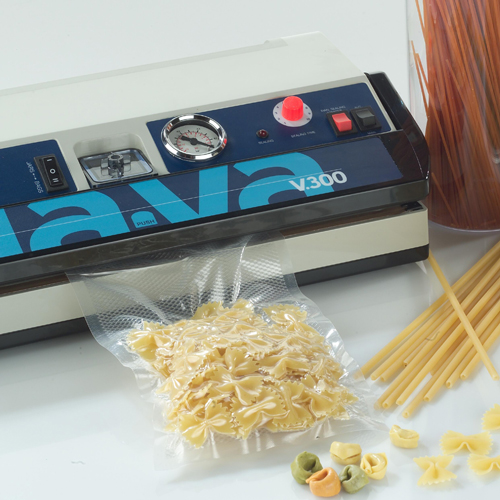 Для упаковки используются гофрированные вакуумные пакеты для продуктов. Глубина откачки вакуума составляет более 90%, что является лучшим показателем в сегменте бескамерных моделей упаковщиков.