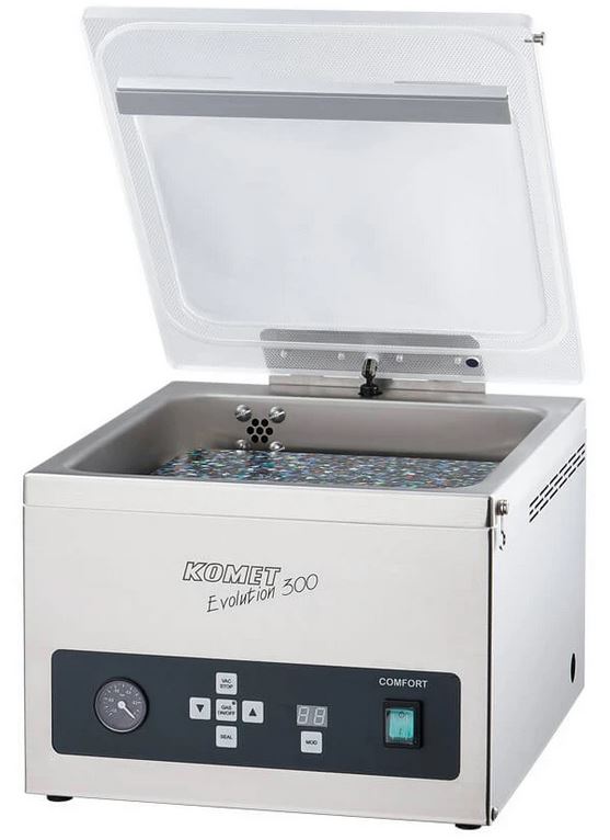 Вакуумный упаковщик KOMET EVOLUTION 300 PRO используется предназначается для вакуумной упаковки мяса, сухофруктов, хлебобулочных изделий, гранулированных, порошкообразных и жидких продуктов на предприятиях общественного питания, торговли и пищевых производствах. Материал выпуклой крышки - плексиглас, удобна для упаковки супов и соусов.